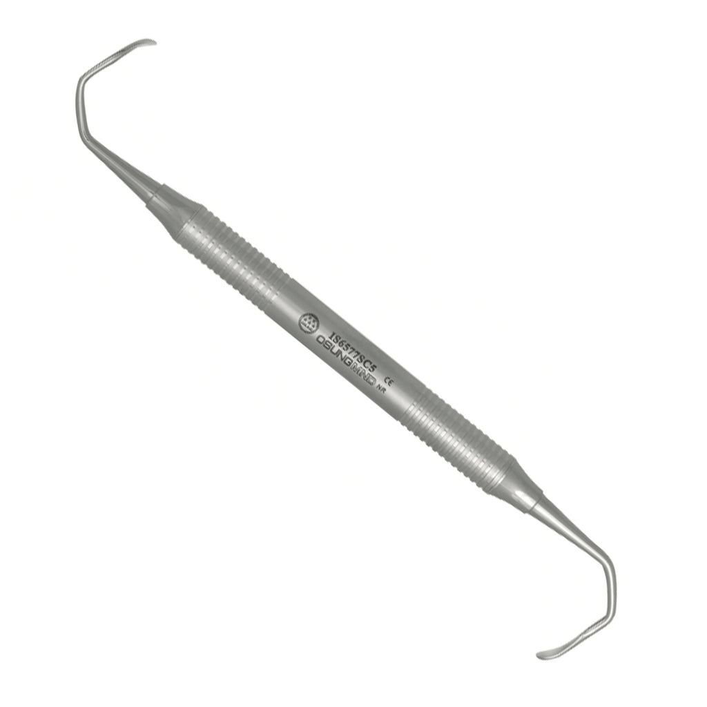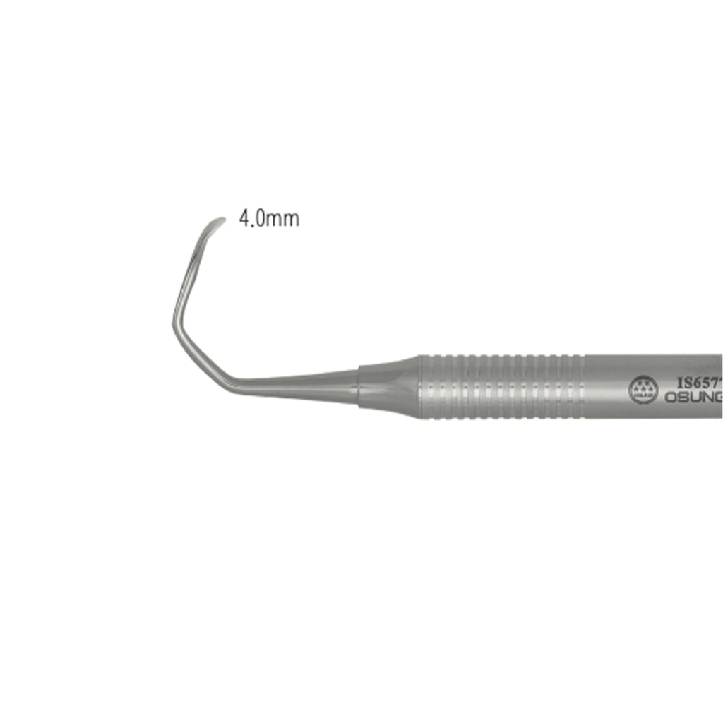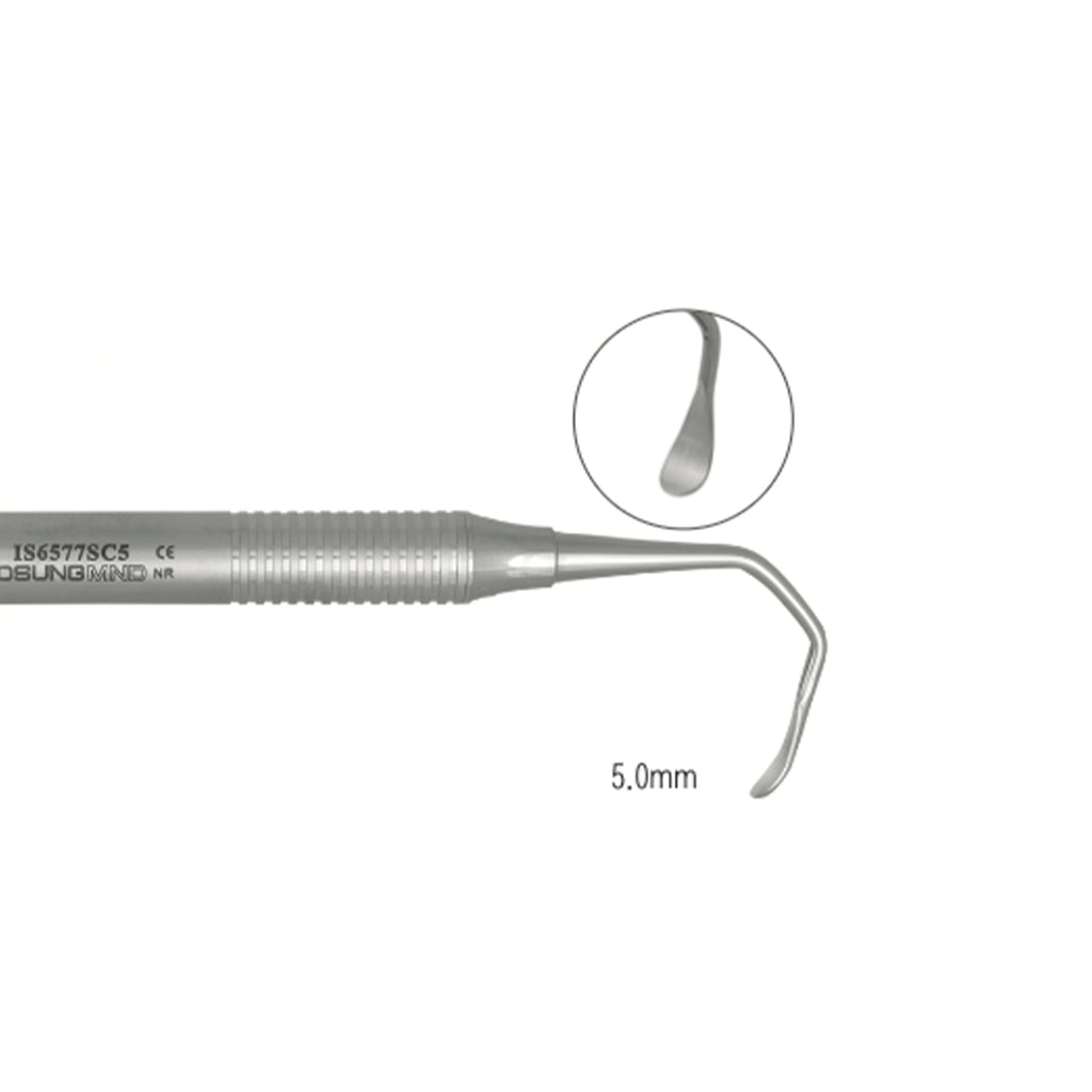 Kramer-Nevins Sinus Lift Instrument (IMP6577SC-5) for acute angles with SMALLER Spoon blades width on one side compared to IMP6577SC . Spoon Blades width (4 mm/5 mm). The acute design will facilitate access to the mesial, distal, superior or inferior aspect. Designed to further separate the sinus lining from the bone, without fraying or tearing. IMP6577SC-5