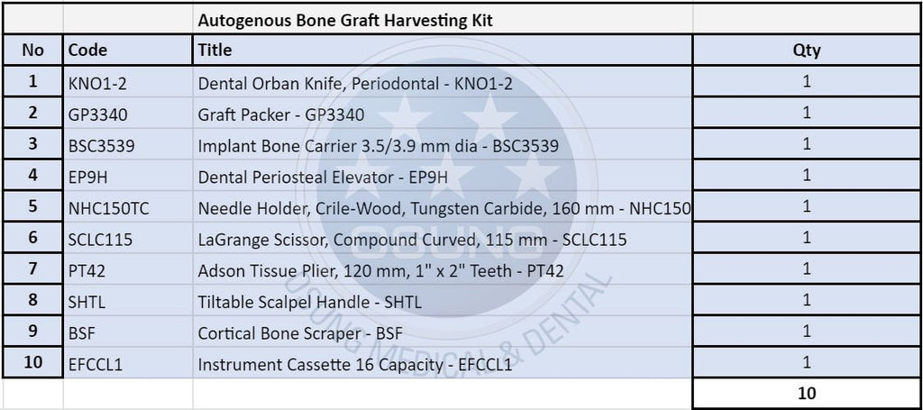 Bone Grafting Kit. It includes most common dental surgery instruments needed for bone grafting procedure. Kit includes 10 instruments (including sterilization cassette)