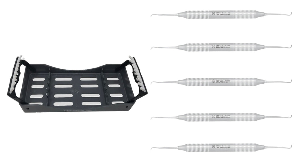 Set of 5 Sickle scalers. These scalers have sharp edges on both sides to remove calculus in posterior. Pointed tip end. Comes with storage and sterilization cassette. Excellent quality. Light Wt Metal Handle for comfortable holding in hand to prevent fatigue. Autoclavable.