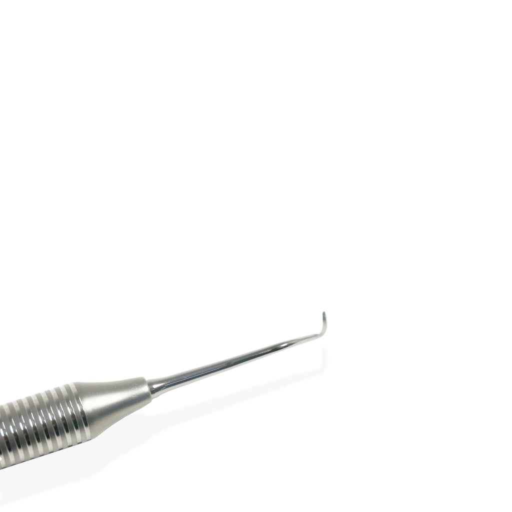 Blades are sharpened on both sides. Blade curved at 90 degrees to the shank with a rounded toe. Designed so that the working ends can be adapted to all tooth surfaces of all regions of the mouth with one double-ended instrument.